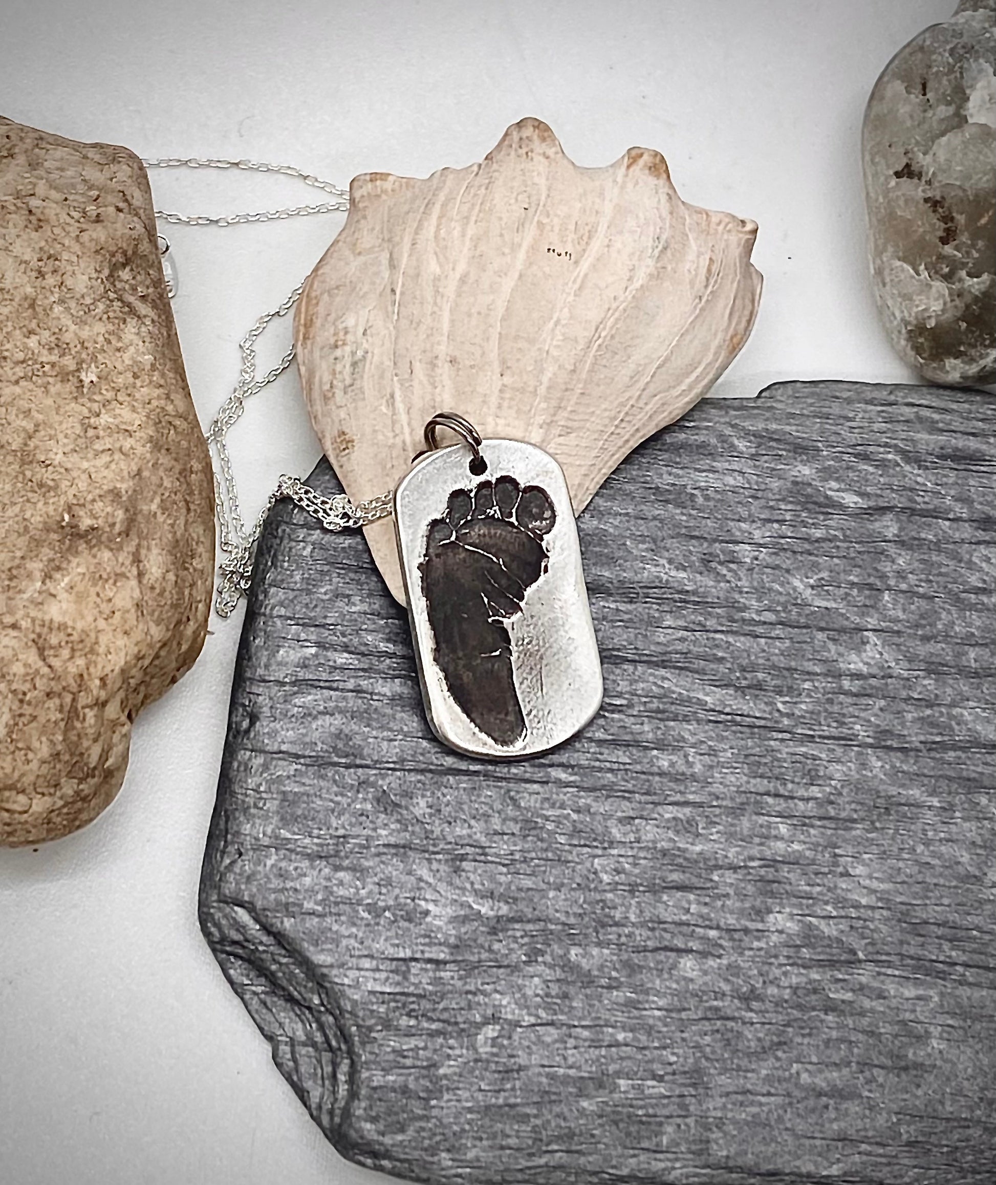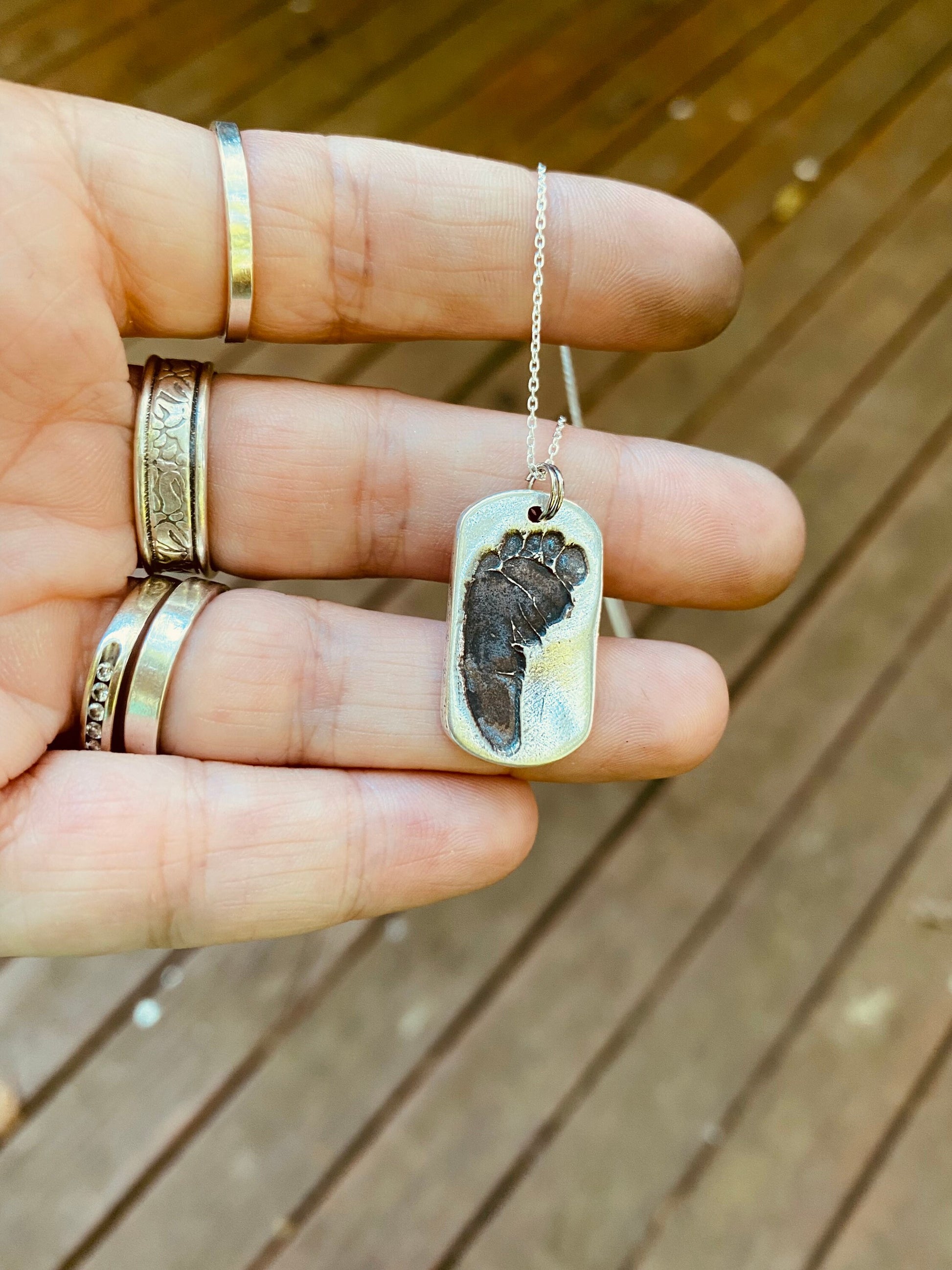 Capture the actual footprint of your baby with this real footprint charm necklace. Choose the perfect chain for dad or mom!