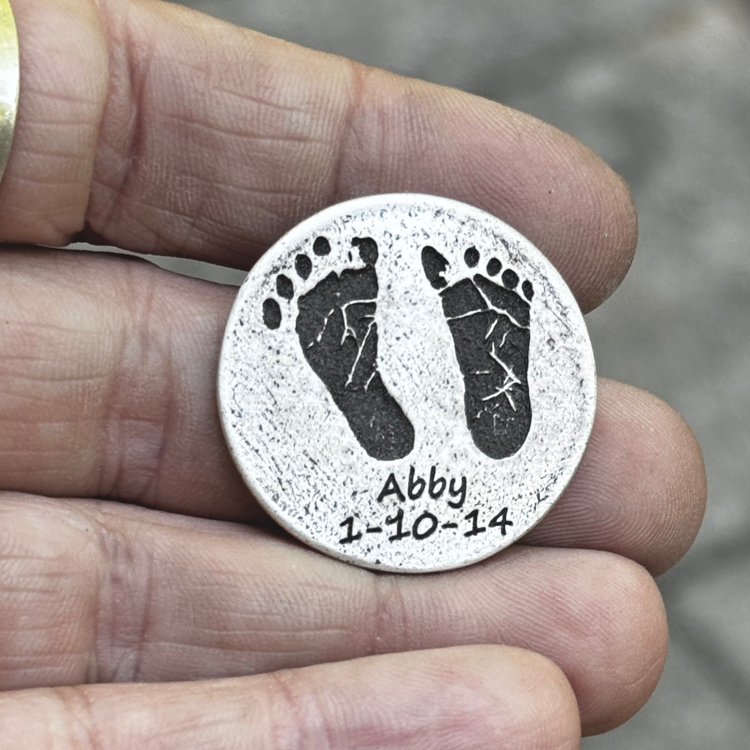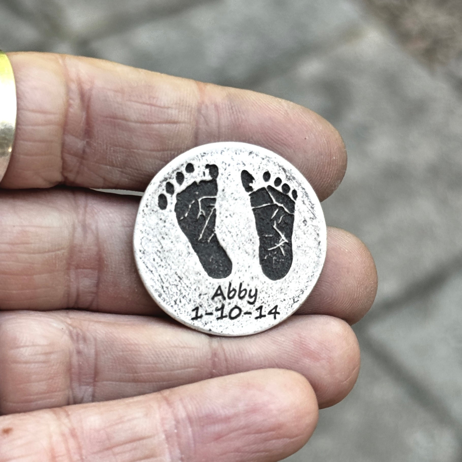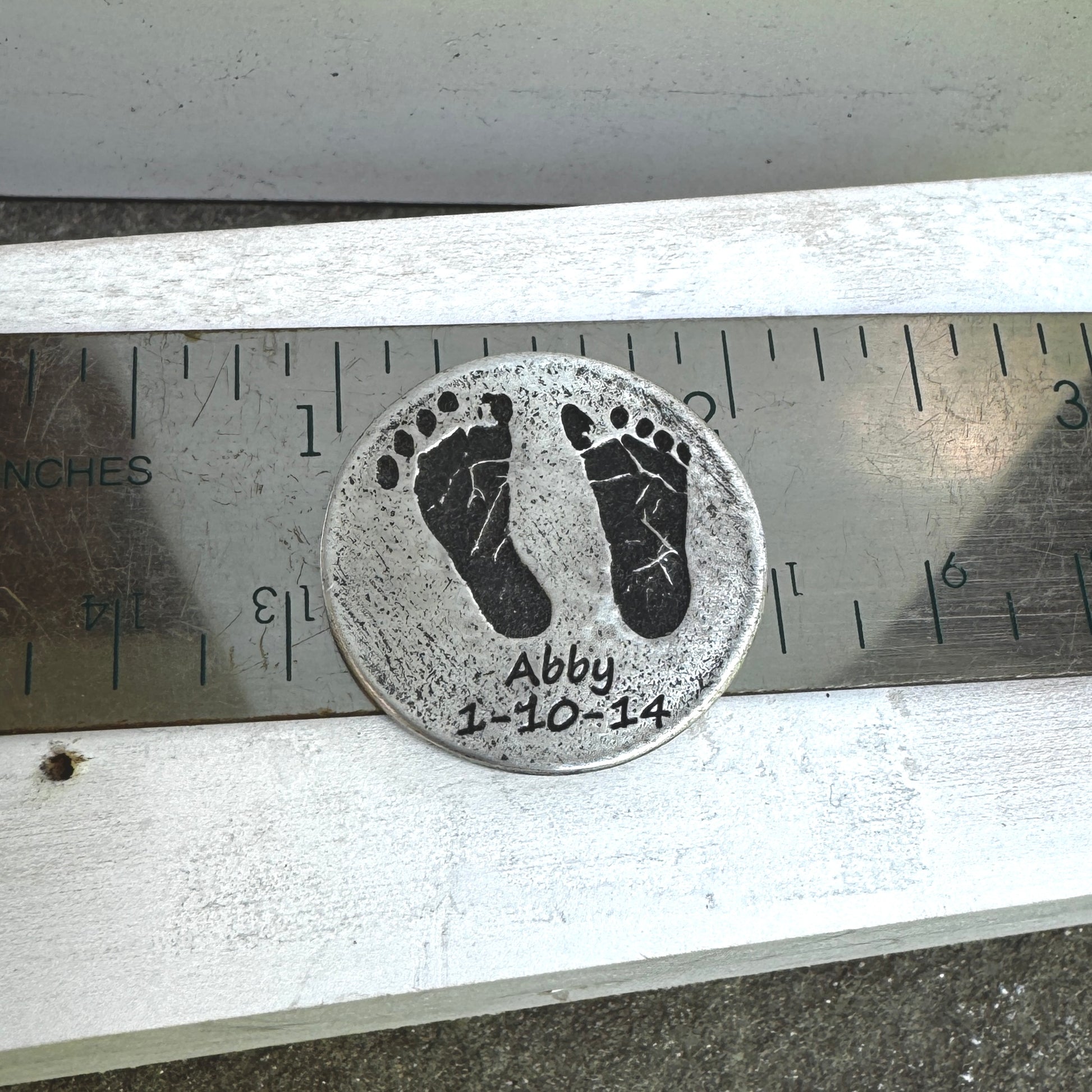 This silver footprint token is the perfect gift for even the hardest to buy for. Capture your baby's first footprints deeply engraved into a pure silver handmade token, along with custom text above or below the prints on the front and the option for personalization on the back, including handwriting or text.
